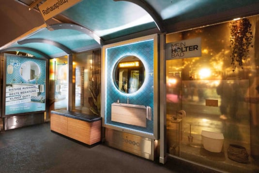 Die Sonderinstallation „MEIN HOLTER BAD“ verwandelt die Straßenbahnhaltestelle am Universitätsring in ein Badezimmer-Setting.