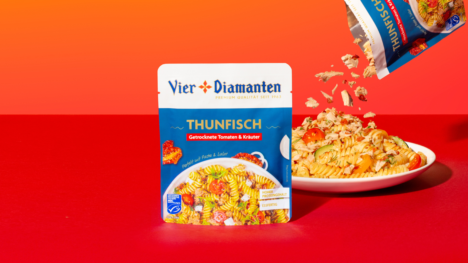 Es galt, den Menschen nicht nur zu kommunizieren, dass Vier Diamanten etwas Neues vom Meer auf ihren Teller bringt, sondern auch, dass die Produkte in neuartiger Verpackung daherkommen. Daher sollten wir auch zeigen, wie der Thunfisch aus den Pouches heraus- und auf die verschiedenen Beilagen draufkommt. Das wiederum stellte uns vor die Herausforderung, dies möglichst ansprechend, appetitlich und für alle Sorten optisch in gleicher Art und Weise rüberzubringen.