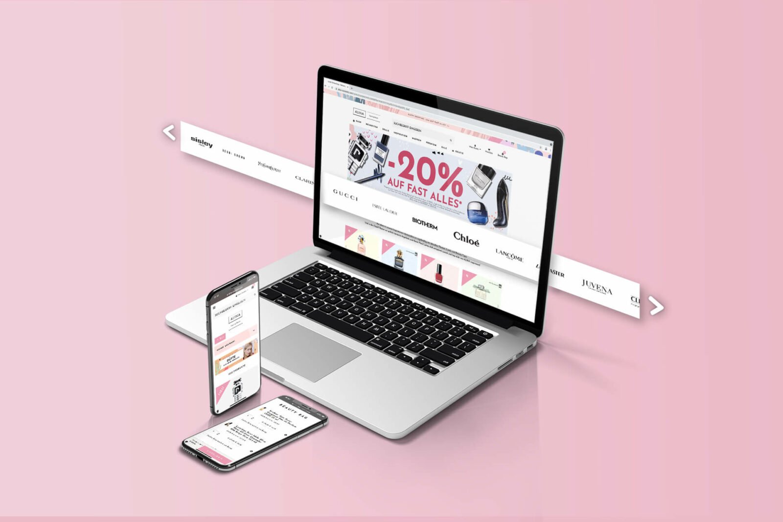 Passend zu dieser Positionierung wurde auch ein Corporate Design kreiert, das so wandelbar und vielseitig sein sollte, wie unsere Zielgruppe selbst. Darum besteht das neue Design aus einer Kombination von vielen verschiedenen Mustern, Beauty-Bildern und Pastelltönen, die immer wieder neu angeordnet werden, wodurch sie mal mehr, mal weniger auffällig sein können. Damit wollen wir zeigen, wie unterschiedlich und facettenreich jede Frau sein kann – denn Schönheit hat ja bekanntlich viele Gesichter. Mittels aufwendiger Programmierung wurde die neue Online-Parfümerie zum Leben erweckt.