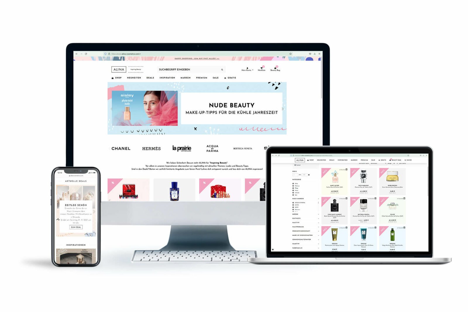 ALINA Cosmetics ist die Parfümerie für hochwertige Düfte, Pflege- und Kosmetikartikel zum fairen Preis. Die Markenprodukte werden bereits in vier stationären Filialen vertrieben – nun sollte auch ein umfassendes, neuartiges E-Commerce-Konzept entwickelt werden. Eine großartige Aufgabe, die wir gleich noch größer angedacht haben: So entstand aus der Erstellung eines Online-Shops auch eine neue Positionierung inklusive eines umfangreichen Corporate Designs und eines Kommunikationskonzepts.