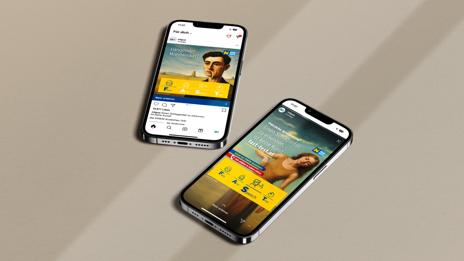 Unter der Dachaussage „Einen Schlaganfall zu erkennen, ist keine Kunst“ werden die klassischen Schlaganfall-Symptome in Form von Kunstwerken visualisiert. Die 4 Hauptsujets entsprechen dabei den Schritten des FAST-Tests: „Face“, „Arm“, „Speech“ und „Time“.