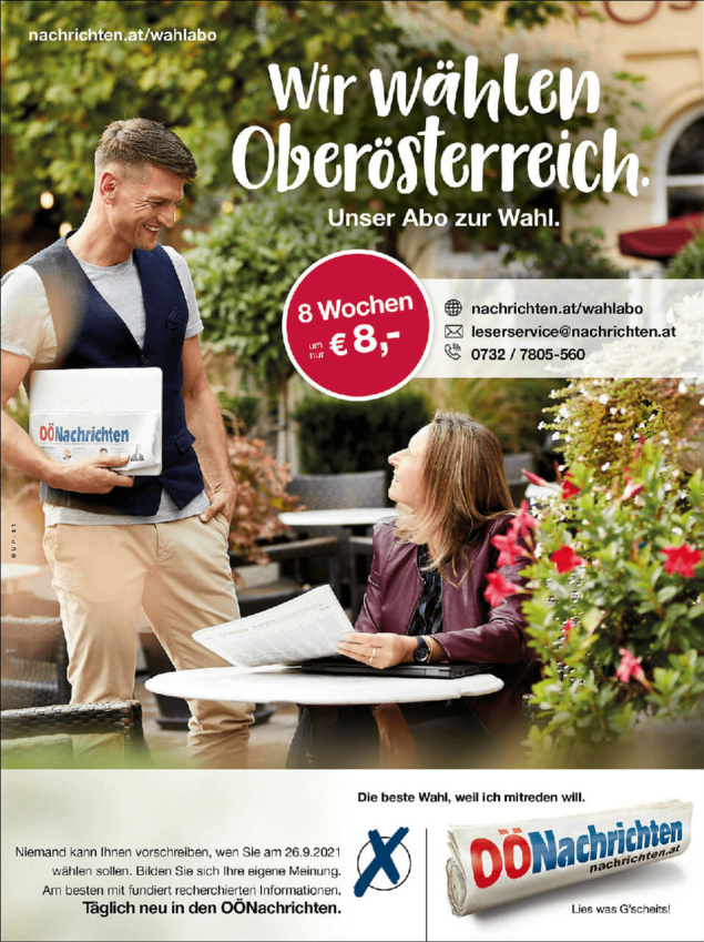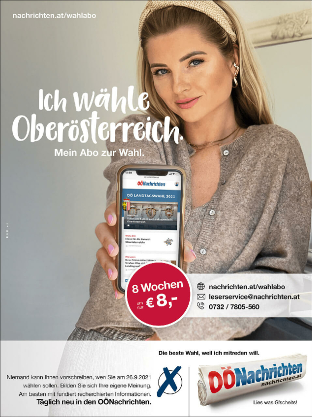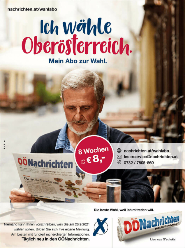 Am 26. September 2021 fand die oberösterreichische Landtagswahl statt. Was die richtige politische Wahl ist, sei jedem selbst überlassen – die richtige Wahl in puncto Information ist jedoch zweifelsohne die Nummer 1 unter Oberösterreichs Tageszeitungen: die OÖNachrichten. Um die OberösterreicherInnen bei der Meinungsbildung zu unterstützen, rief das Leitmedium eine Kurzabo-Aktion ins Leben, deren Bewerbung REICHLUNDPARTNER konzipieren durfte.