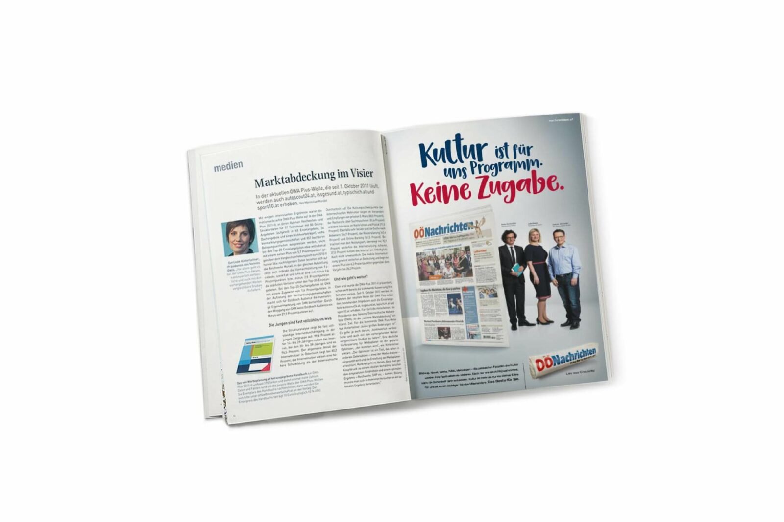 Von klassischen Printanzeigen über Out-of-Home bis hin zu Hörfunk und Online: Stellvertretend für die vielen Mitarbeiter der OÖNachrichten werden je nach Ressort repräsentative Führungspersonen in Szene gesetzt. Unter anderem kommt im Radiospot der Chefredakteur der OÖNachrichten, Herr Mag. Gerald Mandlbauer, zu Wort und gibt für die Öffentlichkeit relevante Qualitätsstatements ab.