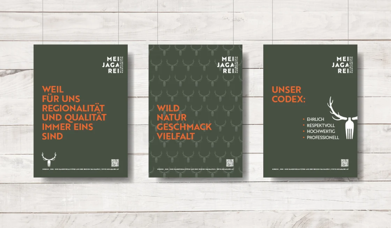 Honest, respectful, high-quality, professional – this is the codex of the MEI JAGAREI game meat manufactory. This is also reflected in the new brand identity. The logo is kept simple, while the fork with deer antlers is an eye-catcher and design element on various advertising materials. A stylish color palette runs through the individual product groups. REICHLUNDPARTNER created labels for the ready-to-eat specialties and banderoles for the hard sausage products. We also designed matching product sheets with tips from the chef and other advertising materials such as business cards, stationery, an information folder, POS branding, jute bags and stickers for refrigerated trailers and company cars. It’s not just the game specialties available in the MEI JAGAREI store in Windischgarsten that are a treat. The entire brand image also whets the appetite for more!