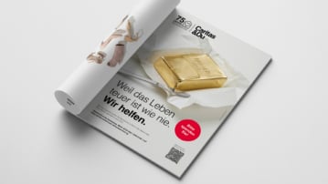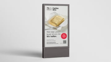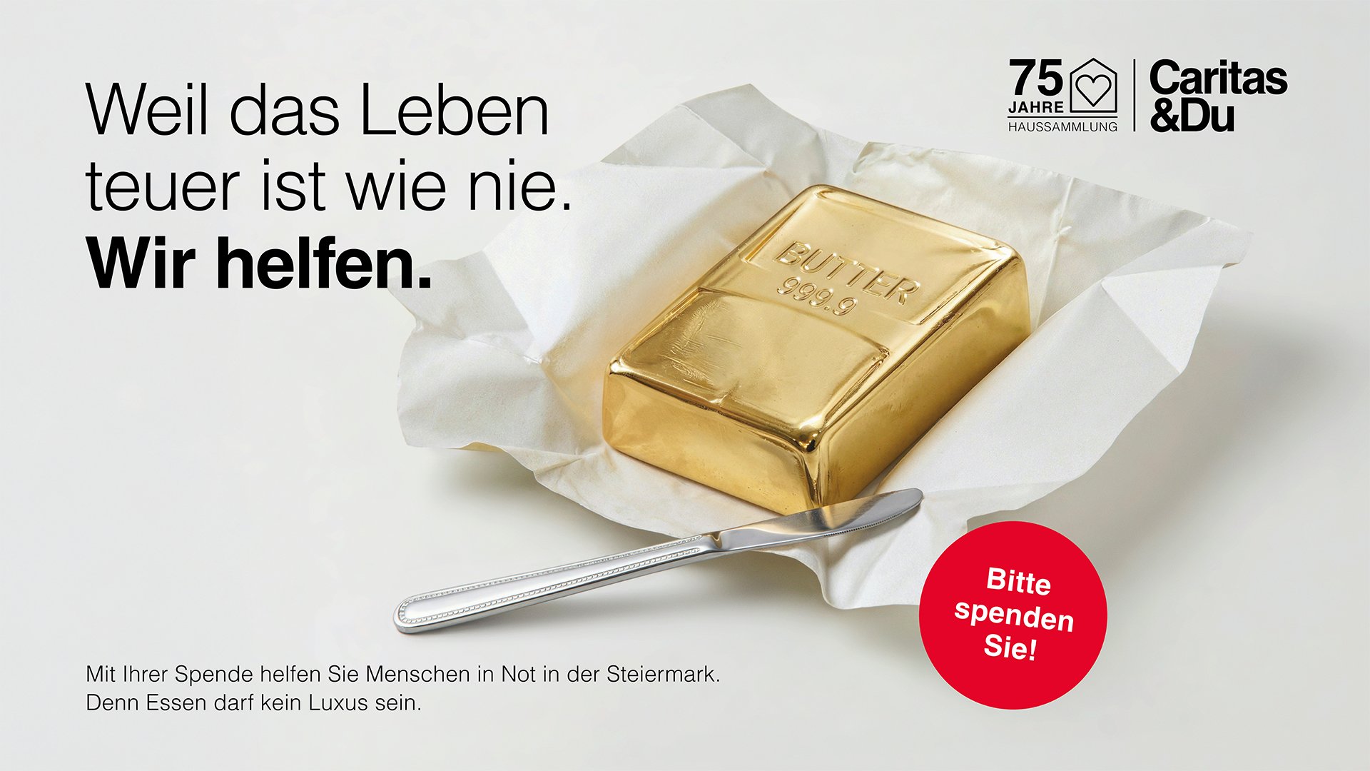 Um diese Botschaft zu transportieren, wird die Entwicklung der Lebenshaltungskosten durch ein starkes Symbol visualisiert: Ein Packerl Butter – inszeniert aus purem Gold – steht für die hohen Preise von Lebensmitteln. Der textliche Aufhänger „Weil das Leben teuer ist wie nie. Wir helfen.“ ist im aktuellen Caritas-Wordingstil gehalten.