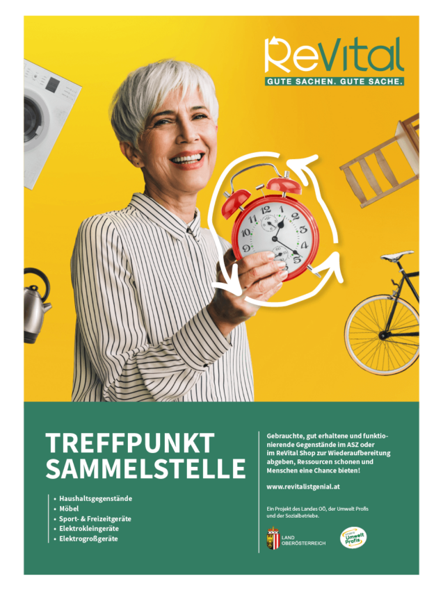 Seit der Gründung 2009 hat sich die Marke ReVital des OÖ. Landesabfallverbandes bewährt: Unter diesem Namen werden gebrauchte, gut erhaltene Gegenstände gesammelt, in qualifizierten sozialen Beschäftigungsinitiativen aufbereitet und schließlich zu günstigen Preisen in den ReVital Shops wieder verkauft. Ein Redesign von Logo und Markenauftritt soll die Bekanntheit dieses ökologisch und sozial nachhaltigen Kreislaufs und die Verkaufszahlen weiter steigern.