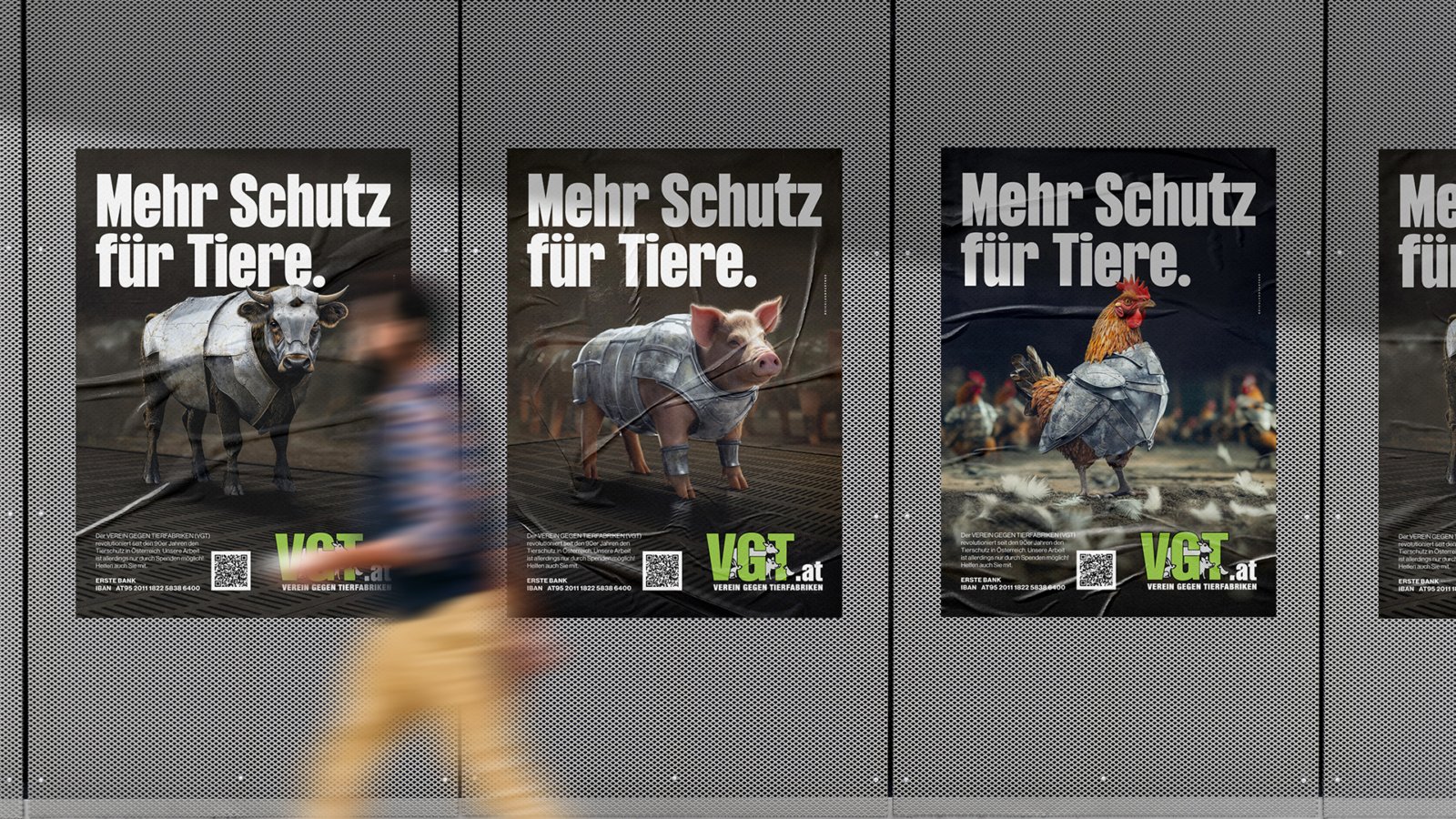 Aufbauend auf dem Insight, dass Lebewesen in der Nutztierhaltung dem Menschen schutzlos ausgeliefert sind, haben wir eine eindringliche Bildsprache entwickelt, die diesen Missstand ins Zentrum rückt. Indem wir Rind, Schwein und Huhn mit Ritterrüstungen ausstatten, visualisieren wir die Bedingungen einer idealen Welt und das Kernbestreben des VGT: Wenn der Verein könnte, würde er jedes Tier mit einem Schutzpanzer ausstatten. Abgerundet wird dieses starke Bild durch die perfekt passende Kernbotschaft: „Mehr Schutz für Tiere.“.