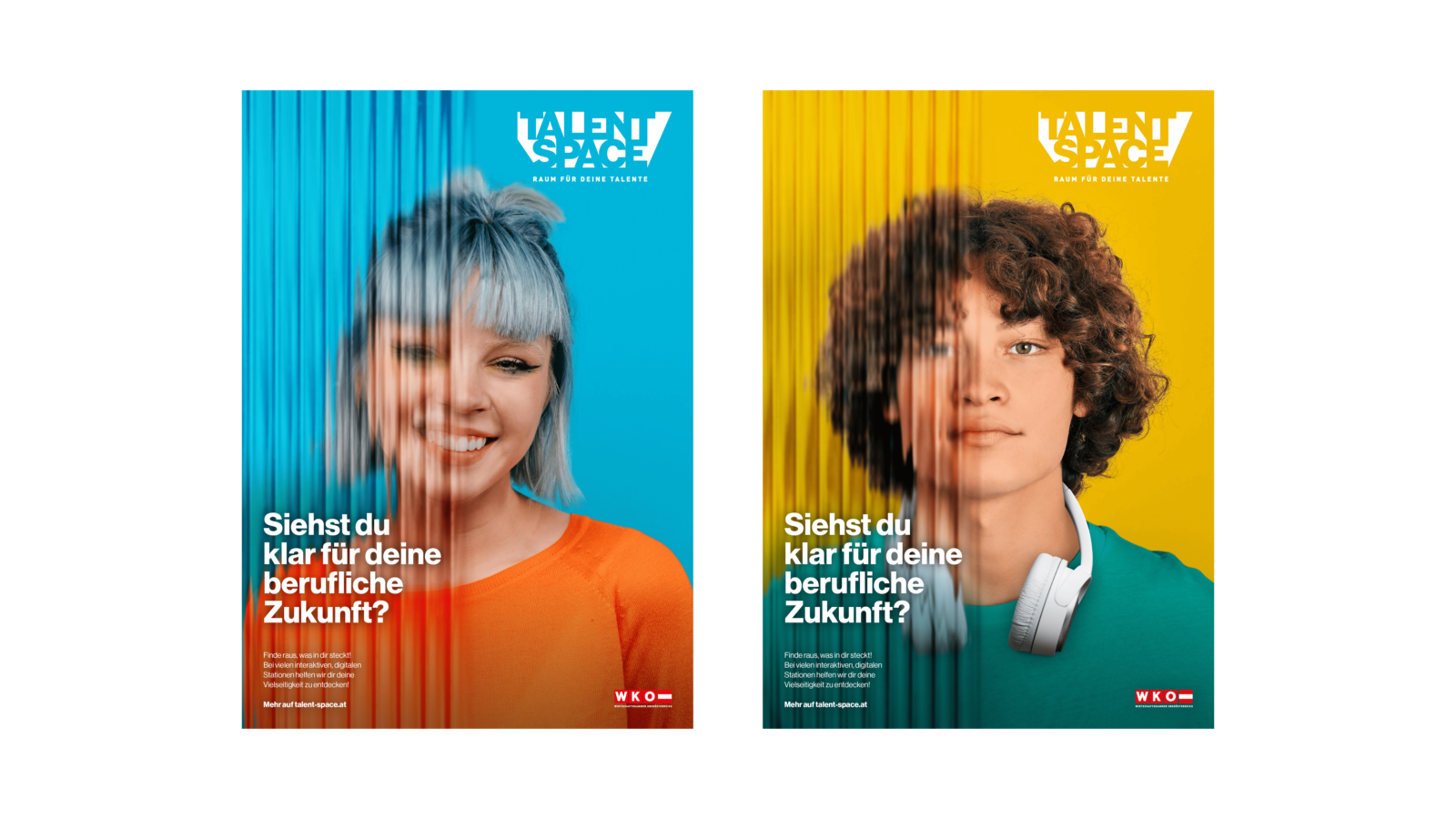 Die Bezeichnung „Talent Space“ entstand aus der Vision „Raum für deine Talente“: ein Name, der den Puls der Zeit trifft und in die Zukunft weist. Inspiriert von Weltraum und Science Fiction, Co-Working-Spaces und Safe Spaces sowie der Idee grenzenloser Möglichkeiten entstand ein Logo voller geometrischer Formen, die Neugier und Wissen miteinander verbinden. Zusätzlich zeigen farbenfrohe Key Visuals junge Menschen hinter einer verschwommenen Glasfläche – eine starke Metapher für die noch verschwommene Zukunft, die hier ein wenig klarer wird. Die leuchtenden Farben ziehen sich durch das gesamte Design bis hin zum Leitsystem, festgehalten in einem maßgeschneiderten CD-Manual. So wurde der „Talent Space“ zu einem inspirierenden Ort, der Perspektiven eröffnet.