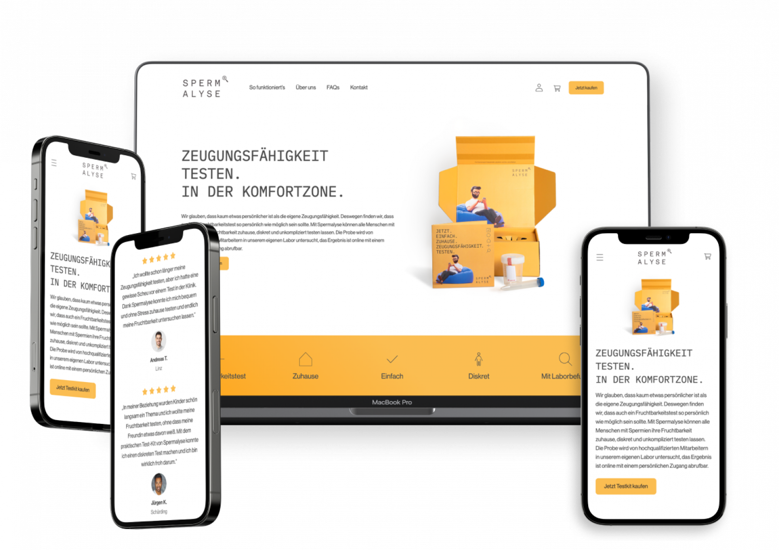 Die Website von Spermalyse bietet Männern die Möglichkeit, qualitativ hochwertige und zuverlässige Spermauntersuchungen bequem von zu Hause aus durchzuführen. Als erster europäischer Anbieter von Fruchtbarkeits-Selbsttests für Männer inklusive Befundes werden die Spermaproben nach den neuesten WHO-Richtlinien analysiert. Unser Ziel war es, einen modernen, ansprechenden und vertrauenswürdigen Markenauftritt zu schaffen, um Männern eine einfache und diskrete Möglichkeit zu bieten, ihre Fruchtbarkeit zu testen.