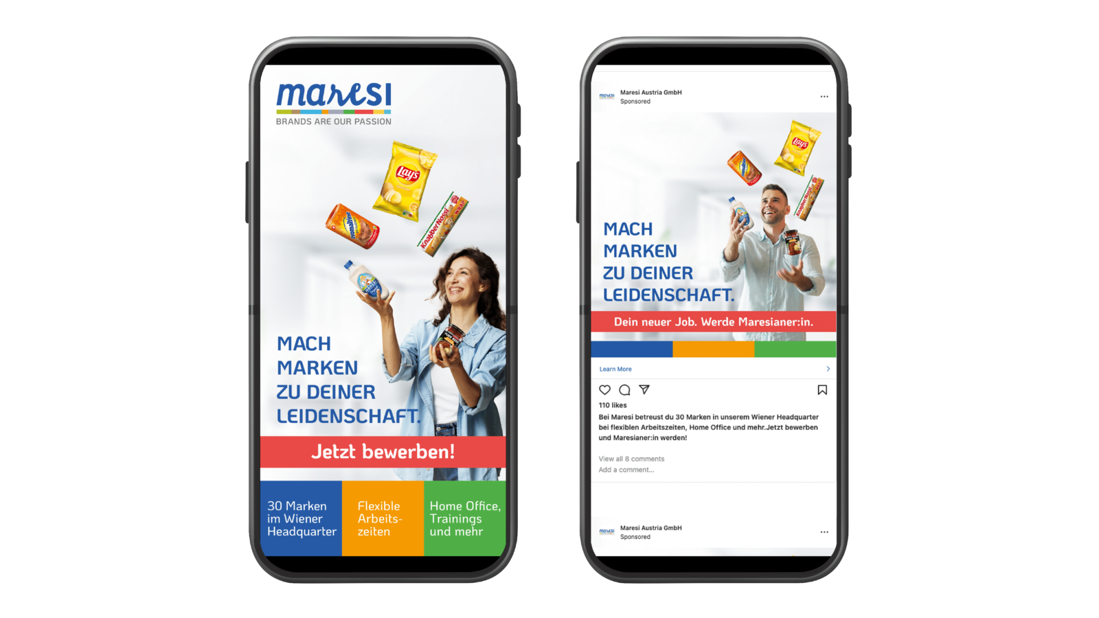 In einem hart umkämpften Markt für Spezialist*innen wollten wir Maresi als Arbeitgeber herausstellen, der mehr bietet – flexible Zeiteinteilung, Home Office und einen hohen Grad an Entscheidungsfreiraum. Um das Unternehmen auch von der Konkurrenz abzuheben, haben wir eine Kampagne entwickelt, die authentisch und modern ist. Sie betont sowohl die Vorteile als auch die vielfältigen Aufgabenbereiche bei Maresi und hebt besonders die Marken Inzersdorfer, KnabberNossi, Shan’shi, Maresi Milch, Ovomaltine und Lay’s hervor. Mit kreativen Ansätzen und einer präzisen Mediaplanung erreichen wir eine breite Zielgruppe in Wien und Umgebung.