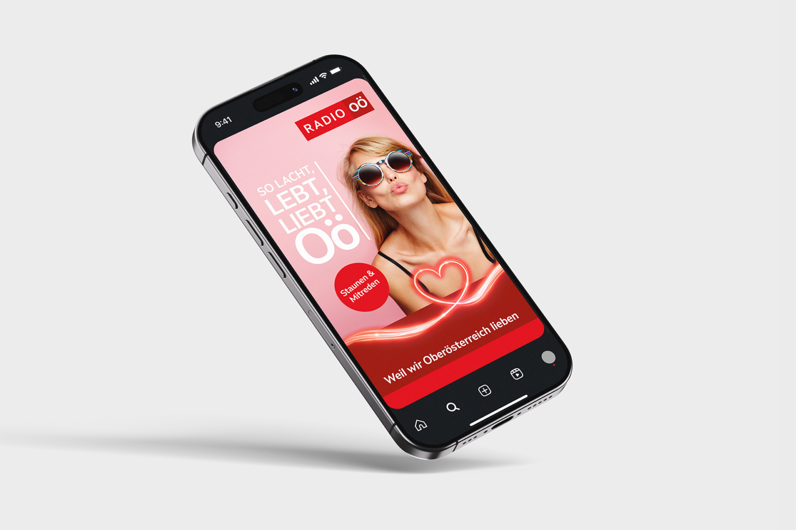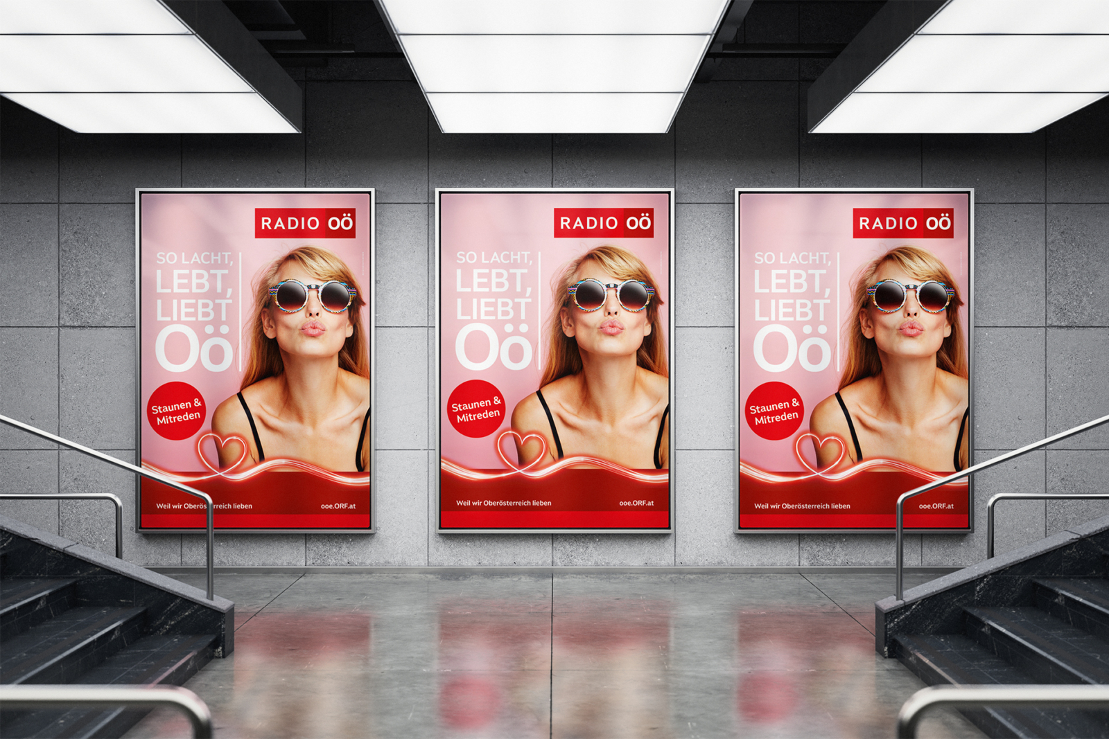Mit einem auffälligen Sujet – passend zum Motto So lacht, lebt, liebt Oberösterreich – wird die Kampagne auf 16-Bogen Plakaten, Citylights, Inseraten und online beworben.